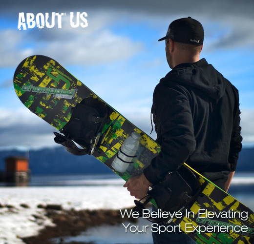 The ChompPad was concept was conceived by three friends out snowboarding, who were faced with the dilemma of what to do with their water bottle in between runs down the mountain. Hydration “backpacks” were expensive, cumbersome and bulky, and stuffing a water bottle into a pant or coat pocket was inconvenient and uncomfortable. Often, half finished hydration bottles were being thrown away at the lodge or in the lift line because the riders simply had nowhere to store their fluids. All three friends agreed, there must be a better way. The idea arose to affix the hydration bottle directly to the snowboard, thereby eliminating the need for a cumbersome backpack, while still allowing the riders easy access to their drink throughout the day. Hence, the ChompPad was born!Now, you can easily access your drink while shredding the slopes. It’s so easy to install, all you do is peel and stick to your board (make sure it is warm for best adhesion) and you’re off and running! Oh by the way, did we mention that this is also one of the best stomp pads in the industry? Gone are the days of having to head back to the lodge in order to re-hydrate, or deciding where to hold your drink while you’re on the slopes. With the ChompPad on board, you will stay hydrated all day and can spend more of your time shredding the mountain! ChompPad. Snowboarding’s revolutionary new on-board bottle retention system.