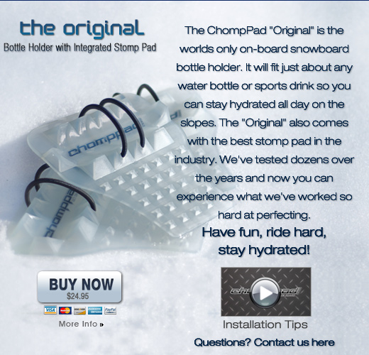 The ChompPad "Original" is the worlds only on-board snowboard bottle holder. It will fit just about any water bottle or sports drink so you can stay hydrated all day on the slopes. The "Original" also comes with the best stomp pad in the industry. We've tested dozens over the years and now you can experience what we've worked so hard at perfecting.Have fun, ride hard, stay hydrated!