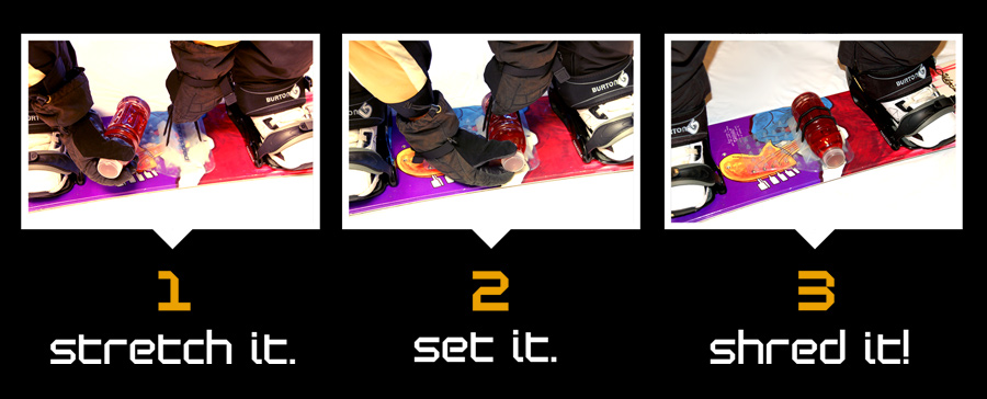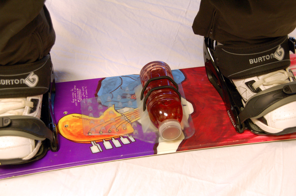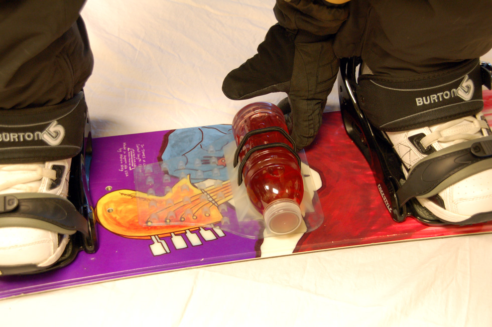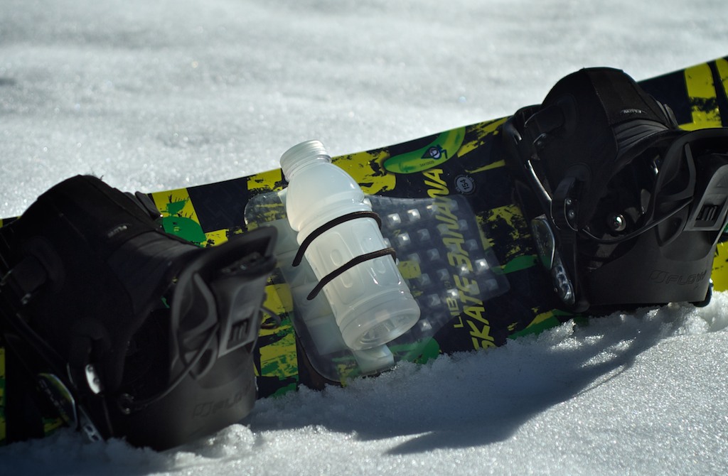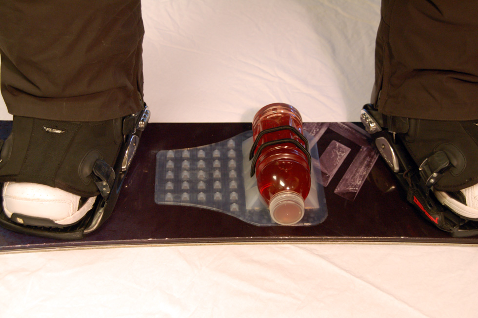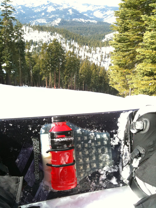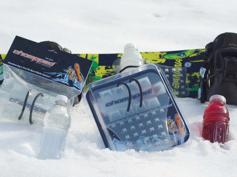 The ChompPad was concept was conceived by three friends out snowboarding, who were faced with the dilemma of what to do with their water bottle in between runs down the mountain. Hydration “backpacks” were expensive, cumbersome and bulky, and stuffing a water bottle into a pant or coat pocket was inconvenient and uncomfortable. Often, half finished hydration bottles were being thrown away at the lodge or in the lift line because the riders simply had nowhere to store their fluids. All three friends agreed, there must be a better way. The idea arose to affix the hydration bottle directly to the snowboard, thereby eliminating the need for a cumbersome backpack, while still allowing the riders easy access to their drink throughout the day. Hence, the ChompPad was born!Now, you can easily access your drink while shredding the slopes. It’s so easy to install, all you do is peel and stick to your board (make sure it is warm for best adhesion) and you’re off and running! Oh by the way, did we mention that this is also one of the best stomp pads in the industry? Gone are the days of having to head back to the lodge in order to re-hydrate, or deciding where to hold your drink while you’re on the slopes. With the ChompPad on board, you will stay hydrated all day and can spend more of your time shredding the mountain! ChompPad. Snowboarding’s revolutionary new on-board bottle retention system.