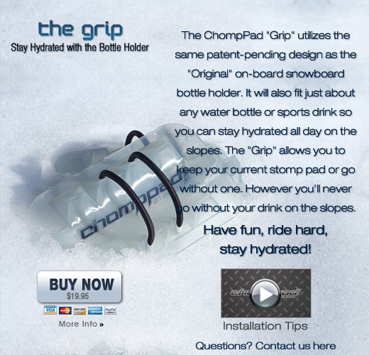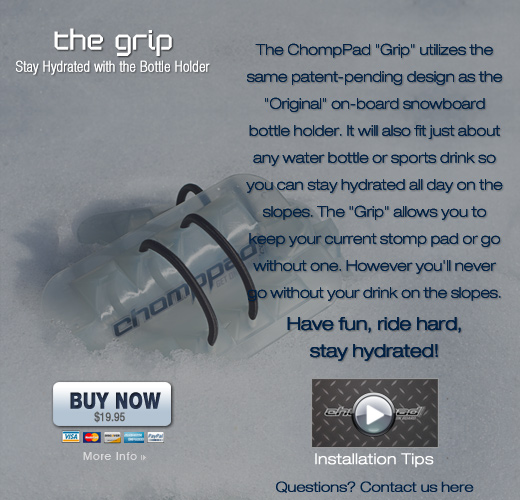 The ChompPad "Grip" utilizes the same patent-pending design as the "Original" on-board snowboard bottle holder. It will also fit just about any water bottle or sports drink so you can stay hydrated all day on the slopes. The "Grip" allows you to keep your current stomp pad or go without one. However you'll never go without your drink on the slopes. Have fun, ride hard, stay hydrated!